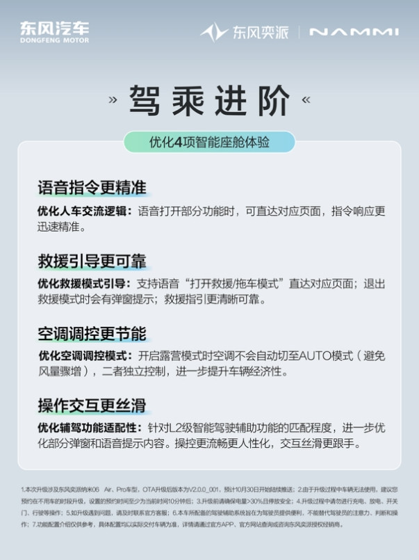 10月30日,东风奕派旗下“国民智趣纯电SUV”——纳米06正式迎来首次OTA升级。作为央企“国家队”,东风奕派用心做好十万级辅助驾驶,本次升级紧密围绕用户日常用车场景,实现全系标配9项L2级智能辅助驾驶功能,深度优化4项智能座舱体验,全面推动纳米06在智能、安全与便捷性方面的高能进阶,为用户打造更成熟、更可靠、更轻松的智能出行新体验。