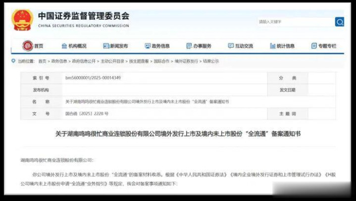 12月11日,中国证监会向湖南鸣鸣很忙商业连锁股份有限公司(以下简称鸣鸣很忙)出具了备案通知书,标志着公司赴港交所上市取得关键性进展。